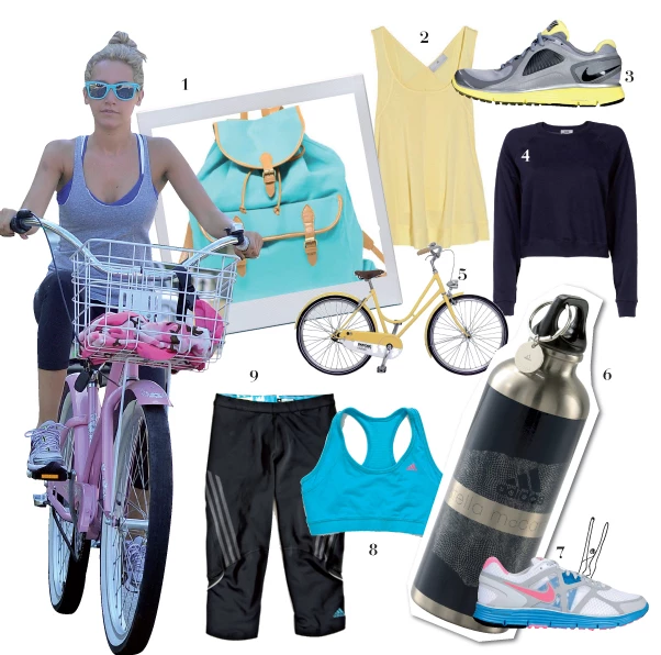 1. Σακίδιο asos.com 32.05€, 2. Τοπ Adidas by Stella McCartney net-a-porter.com 60€, 3. Αθλητικά παπούτσια Nike, 4. Μακρυμάνικο τοπ Acne, thecorner.com, 135€ 5. Ποδήλατο Granturismo Donna Pantone, Abici, designshop.gr 790€, 6. Παγουράκι Adidas by Stella McCartney, 7. Αθλητικά training, Nike. 8. Αθλητικό μπούστο climacool, Adidas, 9. Kολάν running παντελόνι supernova, Adidas