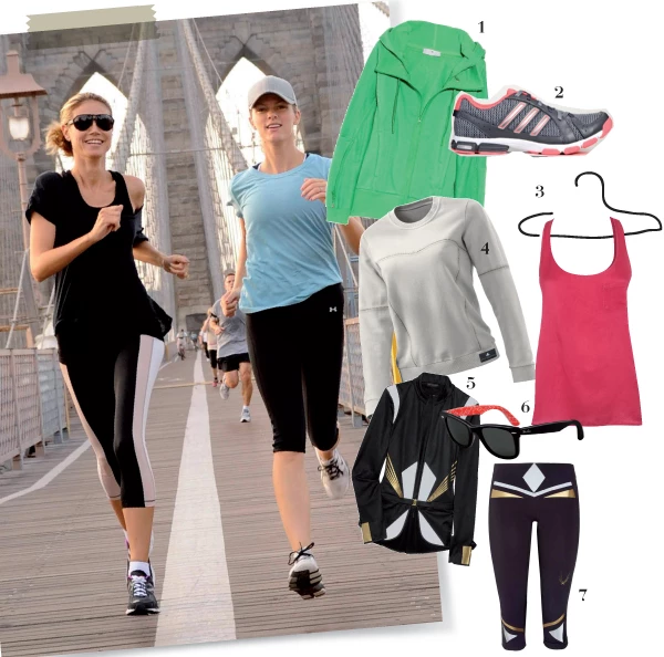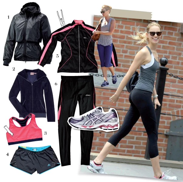 1. Τζάκετ Adidas by Stella McCartney, 2. Ζακέτα Juicy Couture net-a-porter.com, 125€, 3. Αθλητικό μπούστο, Nike, 4. Σορτς running, Supernova Adidas, 5. Κολάν running, Asics, 6. Αντιανεμικό μπουφάν, Asics, 7. Running αθλητικά Gel-Kayano 17, Asics