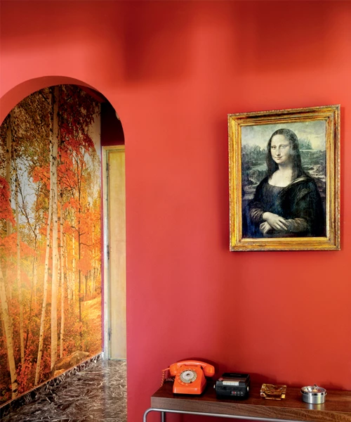 Δοκίμασε στην είσοδο του σπιτιού μια εντυπωσιακή σύνθεση με έντονο χρώμα στον ένα τοίχο και φωτορεαλιστική ταπετσαρία στον άλλο. Είναι μια λύση που ταιριάζει πολύ στα παλιά διαμερίσματα που έχουν διαφορετικά πάτώματα, όπως το μάρμαρο και το ξύλο ψαροκόκαλο της φωτογραφίας.