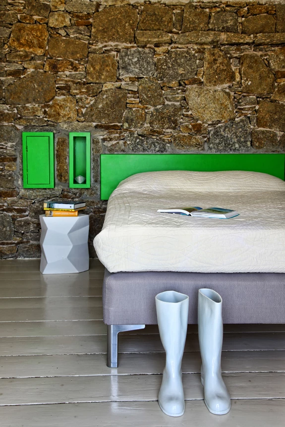 Αν ο τοίχος της κρεβατοκάμαρας είναι πέτρινος εντοίχισε το κεφαλάρι του κρεβατιού και κάποια ντουλάπια και βάψε τα σε έντονο χρώμα. Το αποτέλεσμα είναι πολύ εντυπωσιακό και κερδίζεις και χώρο.