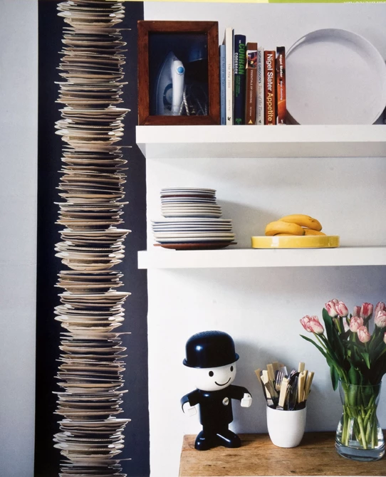 Κάλυψε τις άχαρες εσοχές που περισσεύουν στον τοίχο μεταξύ των ραφιών με έξυπνα αυτοκόλλητα μεγάλης επιφάνειας, όπως αυτό που απεικονίζει στοιβαγμένα πιάτα. Το ίδιο μπορείς να κάνεις σε όλα τα δωμάτια, με ανάλογη θεματολογία.
