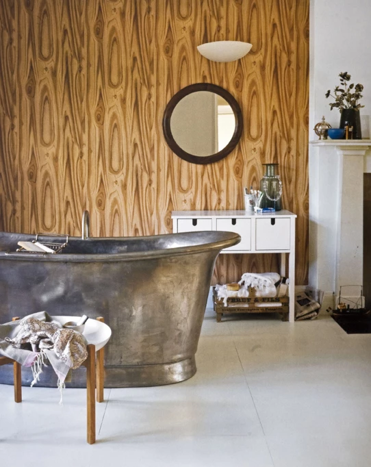 Ανανέωσε το μπάνιο σου αλλάζοντας τον ένα τοίχο με μια μόνο κίνηση. Το μόνο που πρέπει να κάνεις είναι να τοποθετήσεις στον τοίχο ταπετσαρία που μιμείται το ξύλο αυτόματα το μπάνιο θα αποκτήσει μια ζεστή ατμόσφαιρα.