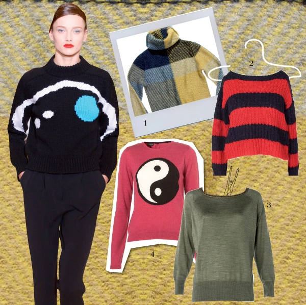 1. Πουλόβερ Benetton, τηλ. 210 3226531-3, 2. Ριγέ cropped πουλόβερ 130€ Ba&Sh, 3. Πουλόβερ με λαιμόκοψη Mango, τηλ. 210-6300428, 4. Πουλόβερ με στάμπα 44€, Τopshop