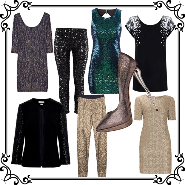 Aπό αριστερά: Μακρυμάνικο φόρεμα BSB 84,90€ / Κολάν με παγέτες H&M 29,95€ / Φόρεμα πράσινο H&M 14,95€ / Μπλούζα με παγέτες στα μανίκια Suiteblanco / Σακάκι με sequined μανίκια Monsoon / Κολάν με χρυσές παγέτες BSB, 79,90€ / Γόβες Dukas / Χρυσό φόρεμα Marks & Spencer