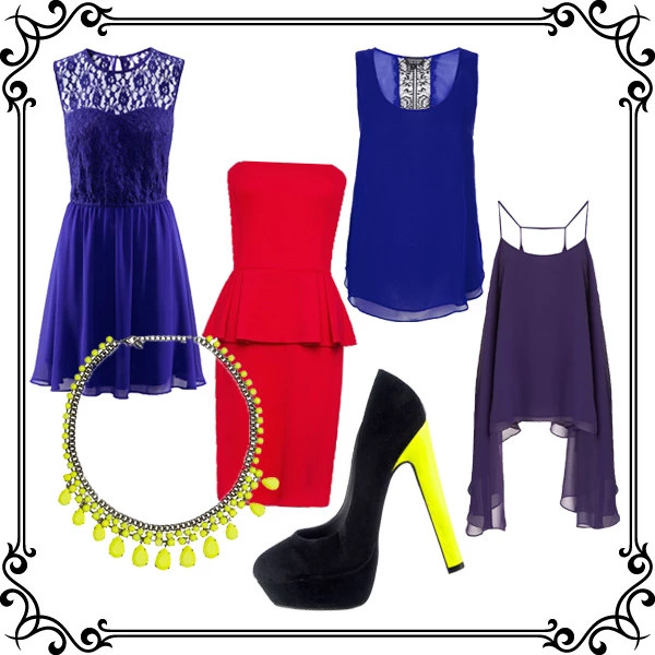 Από αριστερά: Φόρεμα H&M 19.95€ / Peplum Dress Μango 19.95 / Μπλέ μπλούζα Topshop, 35€ / Μωβ μπλούζα Topshop 49€ / Γόβες Fullah Sugah / Κολιέ Zara