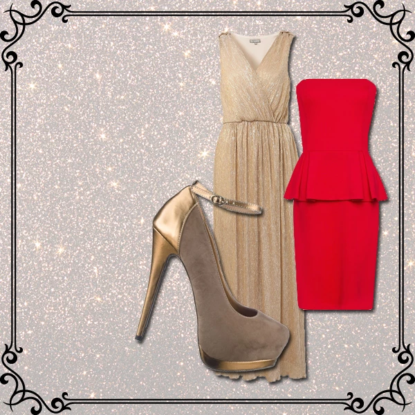Aπό αριστερά: Μακρύ φόρεμα Topshop, 59€ / Μωβ φόρεμα H&M 59,95€ / Σακάκι Mango, 69.99€ / Ασημένια φούστα Zara / Γόβες Fullah Sugah