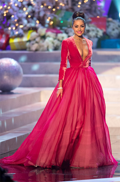 Η νικήτρια του διαγωνισμού Μiss USA, Olivia Culpo με μια βελούδινη magenta τουαλέτα Georges Hobeika Couture.