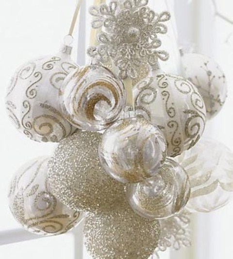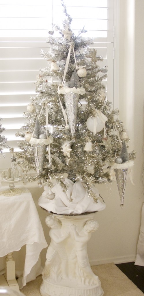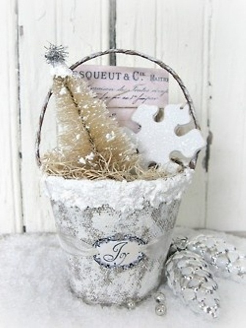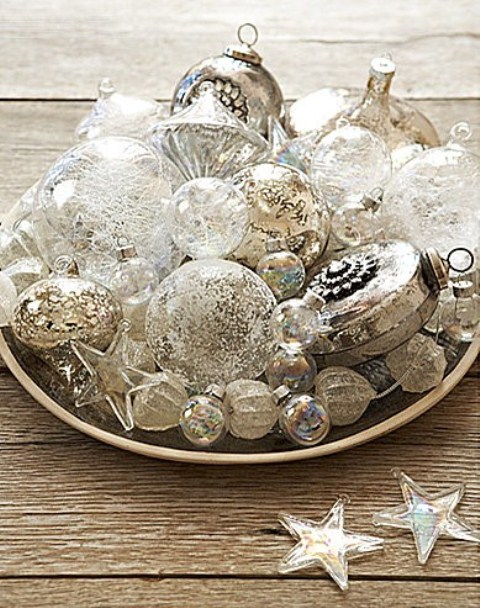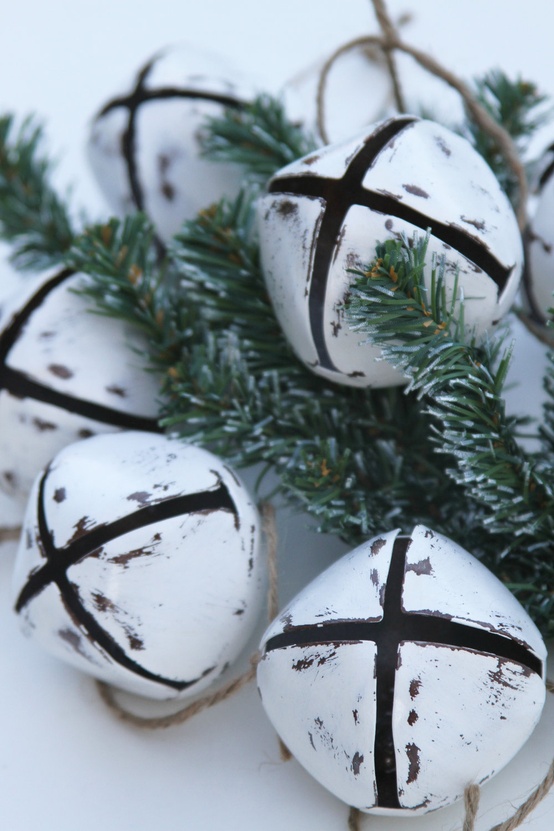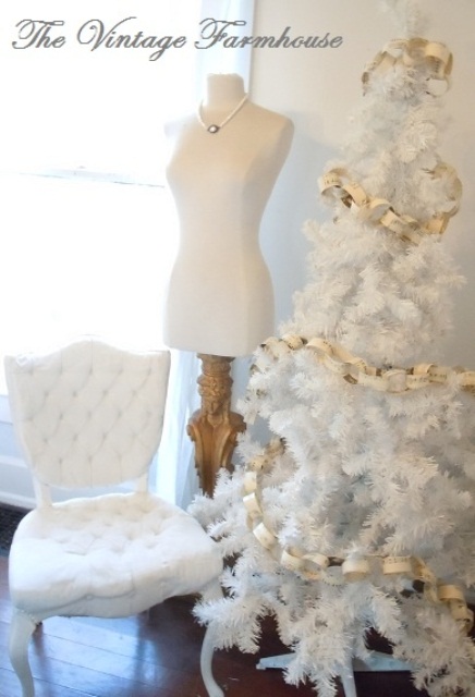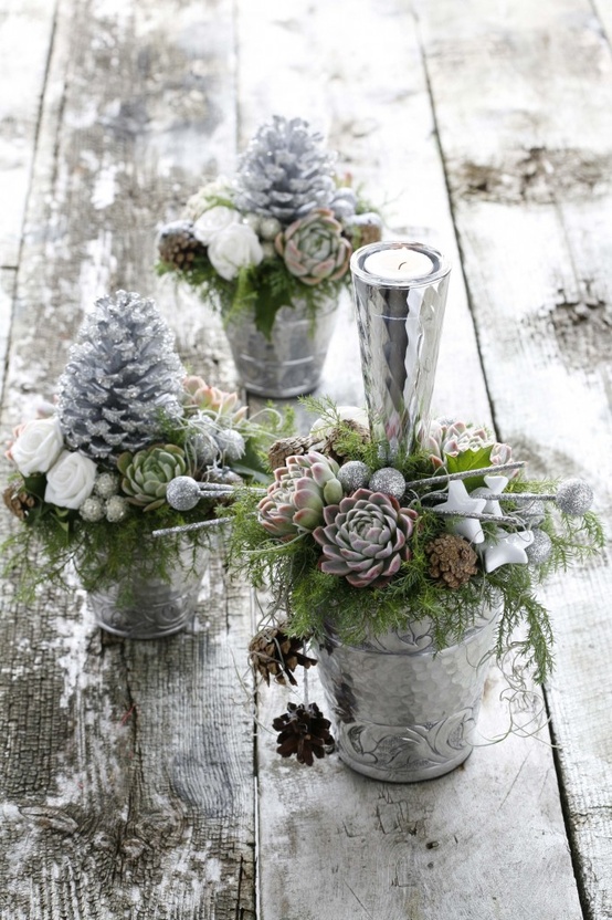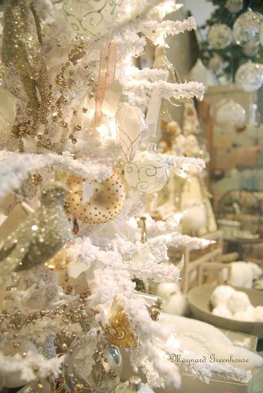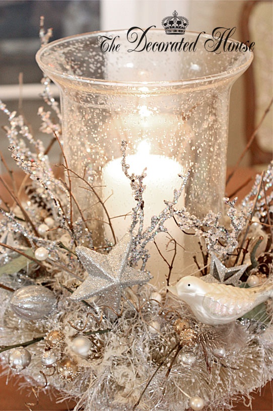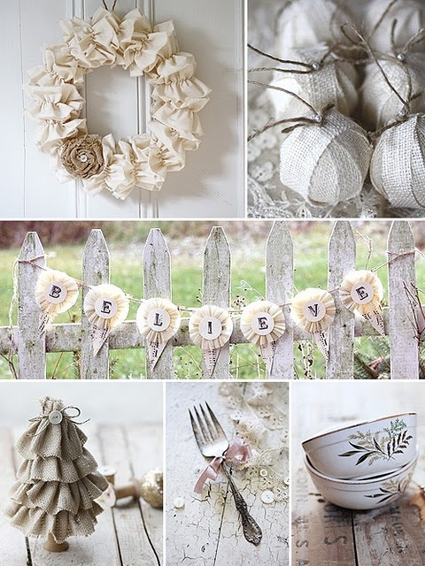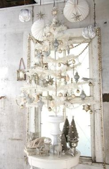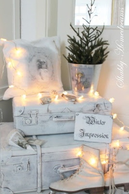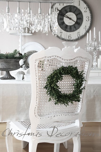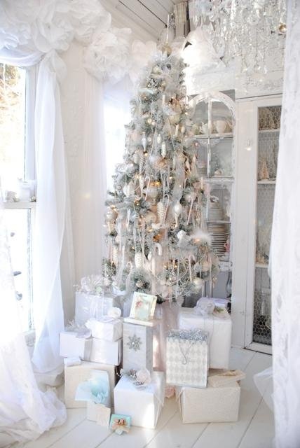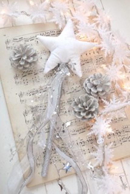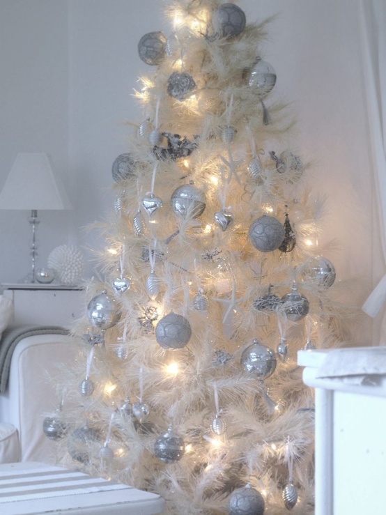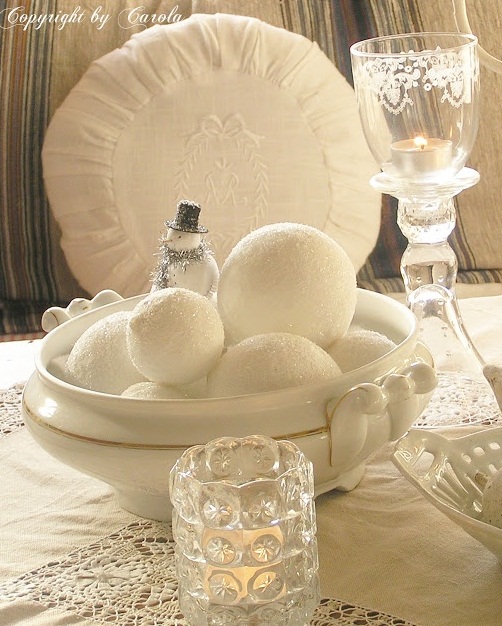 χιονιού, στολίδια και λευκά βαμμένα κουκουνάρια. Λευκά τραπεζομάντιλα,