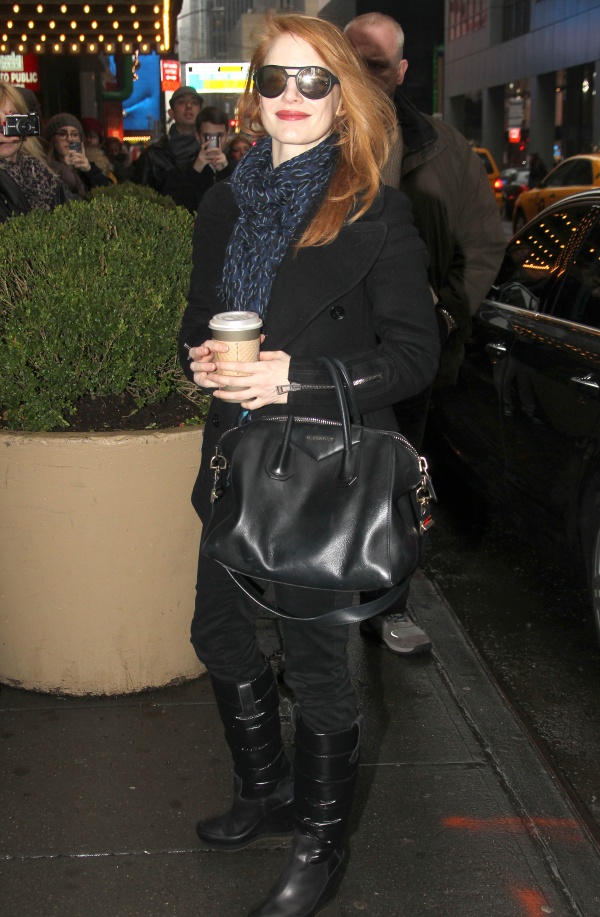 H Tζέσικα Τσαστέιν έξω από το θέατρο πριν την έναρξη της παράστασης στην οποία πρωταγωνιστεί με τίτλο "The Heiress". Αυτή είναι η πρώτη φορά που η βραβευμένη με Χρυσή Σφαίρα ηθοποιός ανεβαίνει στο σανίδι του Μπρόντγουεϊ ενώ στο πλευρό της έχει τον Νταν Στίβενς, πρωταγωνιστή της επιτυχημένης τηλεοπτικής σειράς Downton Abbey.