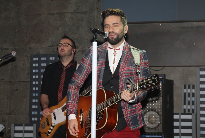 O Θοδωρής Μαραντίνης τραγουδάει κατά τη διάρκεια του πάρτι μετά την πρεμιέρα