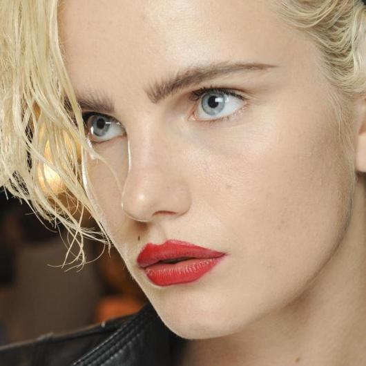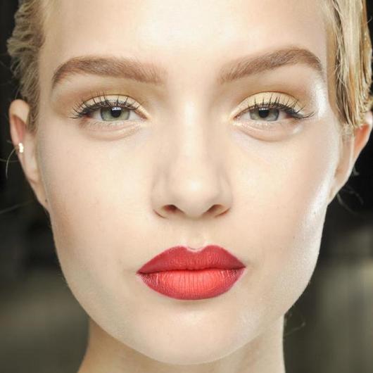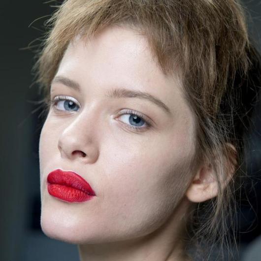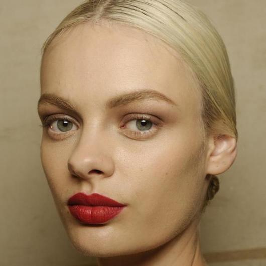 Στον οίκο Loewe είδαμε πως μια σκουρόχρωμη επιδερμίδα μπορεί να αναδειχθεί από ένα καθαρό κόκκινο κραγιόν. Κι εδώ το κραγιόν είναι ματ αλλά η επιδερμίδα ακολουθεί την ίδια γραμμή.
