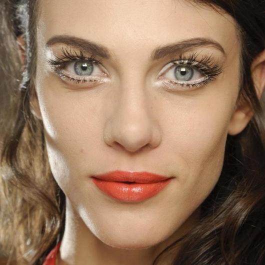 Εκτός από το καθαρό πορτοκαλί χρώμα στα χείλη εδώ είδαμε και τεχνική γεμίσματός τους. Με concealer τα χείλη αποχρωματίστηκαν κι έπειτα με ένα μολύβι χειλιών απέκτησαν νέο σχήμα που έδωσε ένταση στις γωνίες.