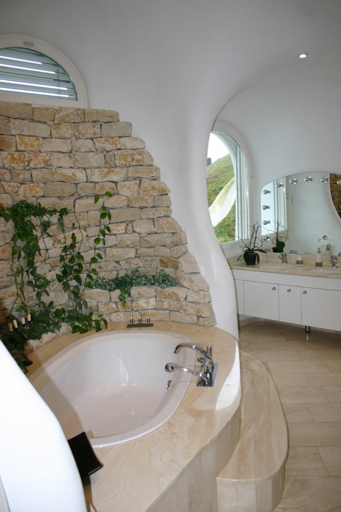 Το υπόγειο γκαράζ είναι κατασκευασμένα με συμβατικά μέσα, ενώ το ισόγειο του σπιτιού είναι κατασκευασμένο με εκτοξευόμενο τσιμέντο (σκυρόδεμα).